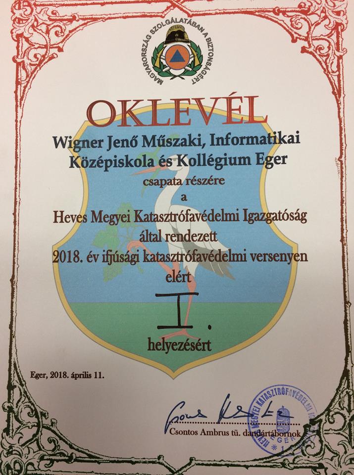 A Városi Katasztrófavédelmi Verseny megnyerése után április 11-én a Megyei Katasztrófavédelmi Versenyen is I. helyezést ért el az iskola csapata (tagjai: Eszenyi Bence, Lénárt Márk, Zagyva Bálint és Zimány Gergő - 10.B osztályosok).