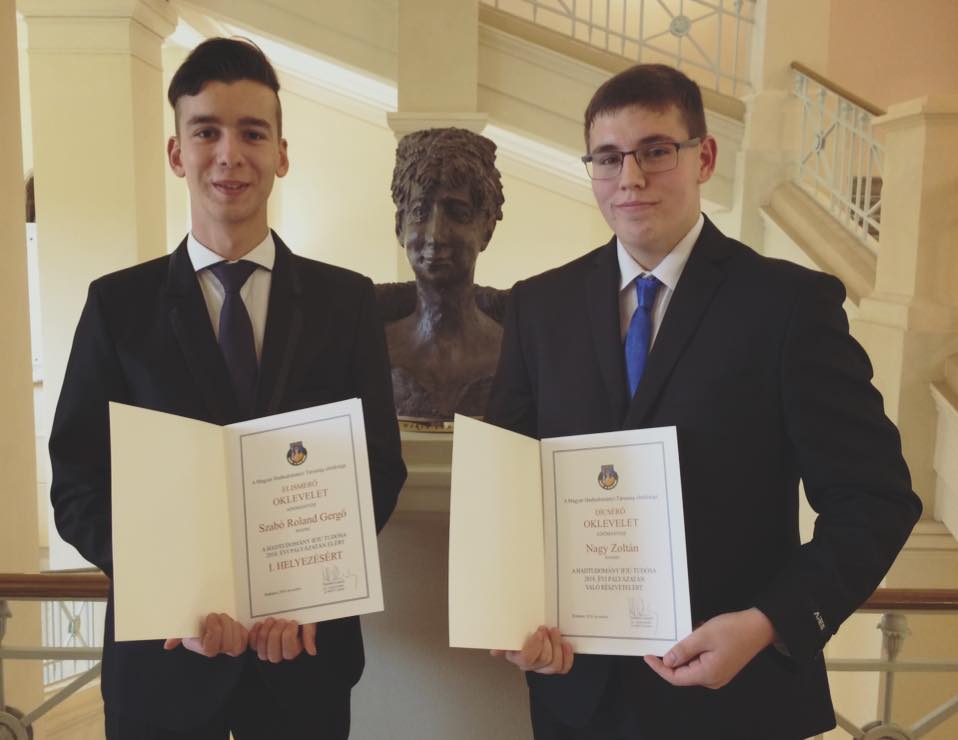 November 13-án került sor a Magyar Hadtudományi Társaság “Honvédelem Ifjú Tudósa” országos pályázat eredményhirdetésére a Nemzeti Közszolgálati Egyetem Ludovika Campusán. Szabó Gergő /12.K/ dolgozata I. helyezést, Jekkel Patrik és Nagy Zoltán /11.B/ dolgozata IV. helyezést ért el. A díjakat Benkő Tibor honvédelmi miniszter adta át. Gratulálunk!